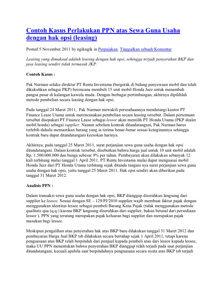 Jul 25, 2021 · contoh kasus sewa guna usaha (leasing) contoh kasus sewa guna usaha atau leasing adalah transaksi perusahaan yang menggunakan manfaat aktiva milik orang lain untuk menjalankan kegiatan operasionalnya.